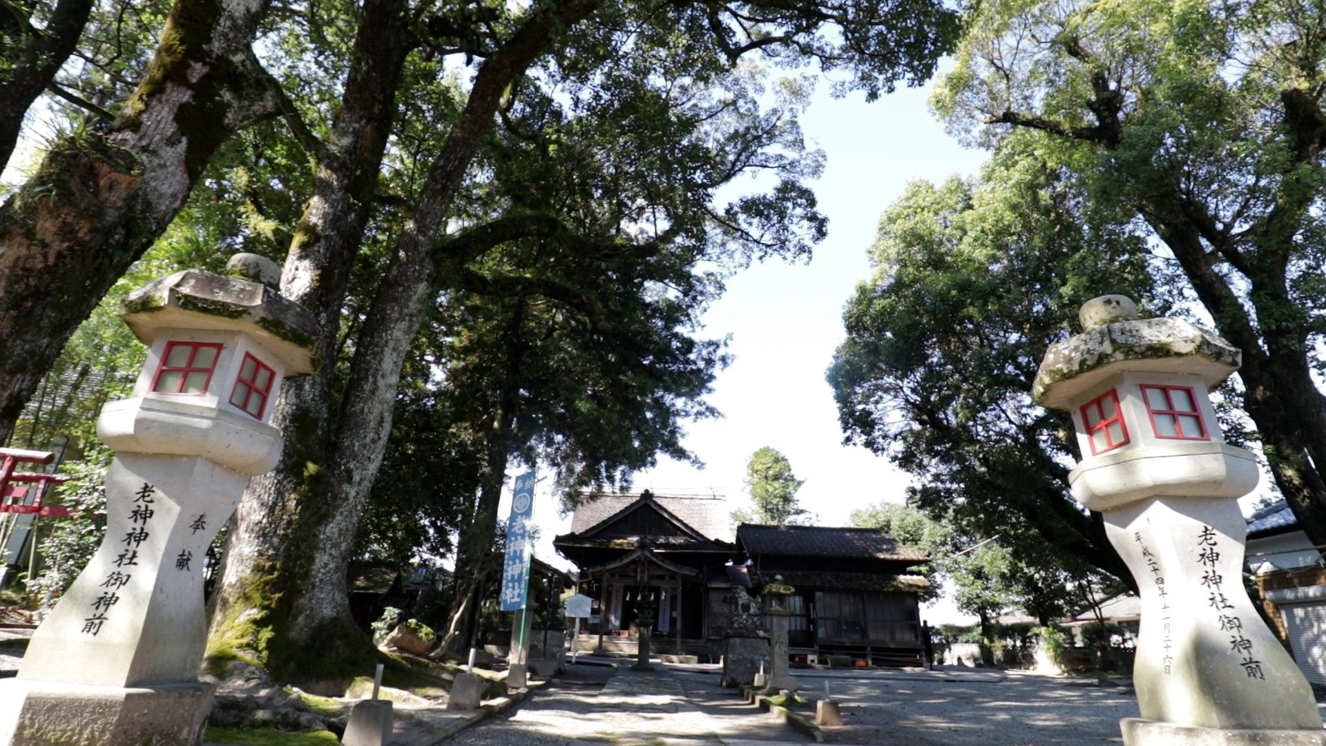 人吉城跡の直ぐ近く、球磨川と支流の胸川の合流場所にある「老神神社」。建てられた年ははっきりとは分からず、一説によると807年、鹿児島県「霧島神宮」からニニギノミコトなどの六神が分霊され神様として崇めました。人吉城跡の直ぐ近くにあるため、後に城主・相良氏一族の産土神(その土地の土地神さまがいる神社)になり、現在の建物は相良家20代当主・長毎によって1628年に新しく造り替えられたものです。