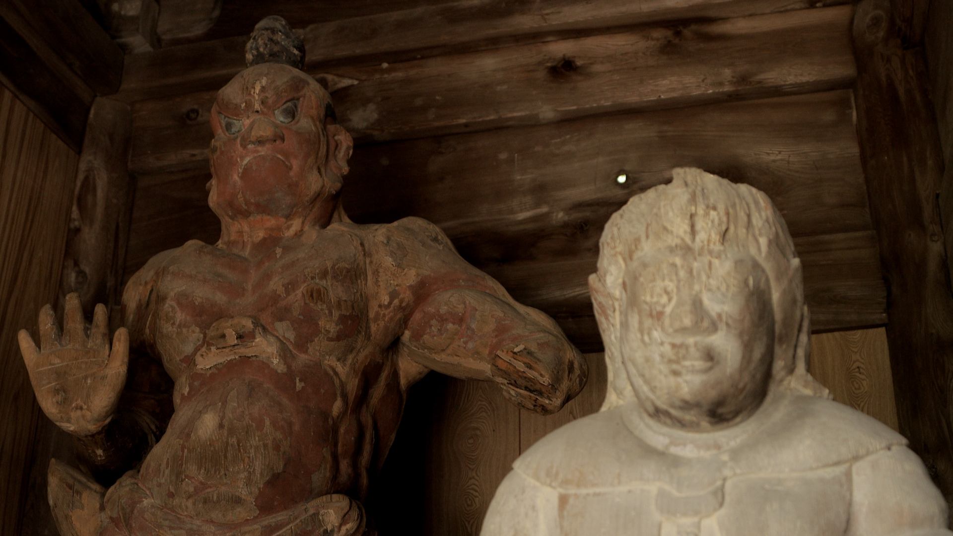 本尊の両側に立つのが木造二天王立像です。向かって左の像は、本尊と同じ木造毘沙門天立像であり、高さ138.2cm、ヒノキ材・寄木造で造られています。向かって右は、木造天部形立像で、高さ135.2cm、ヒノキ材・一木造で、どちらも1147年に造られたと推測されています。